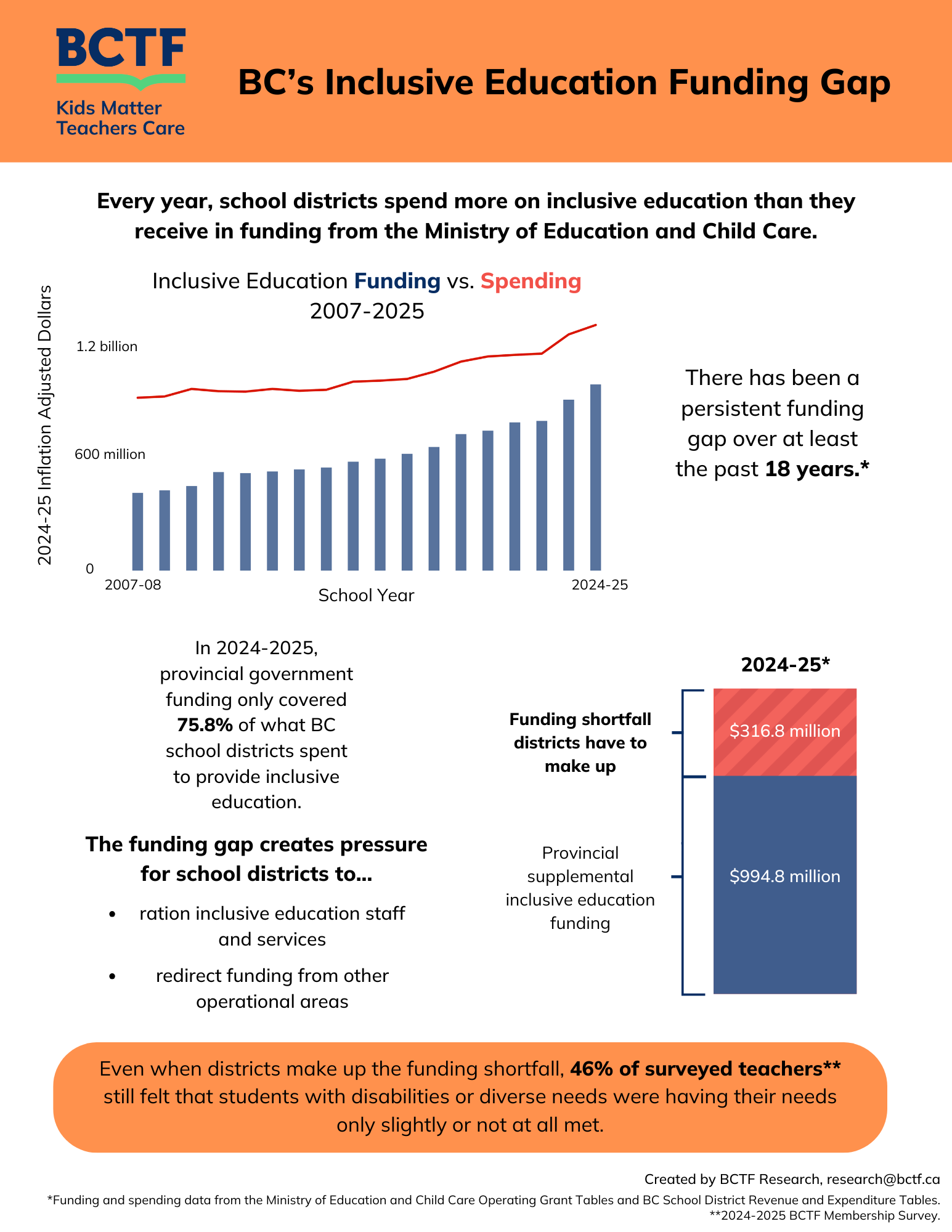 During the 2024/25 school year, provincial government funding only covered 75.8% of what BC school districts actually spent to provide inclusive education. See the BCTF Research Infographic below for more information on BC's enduring inclusive education funding gap.